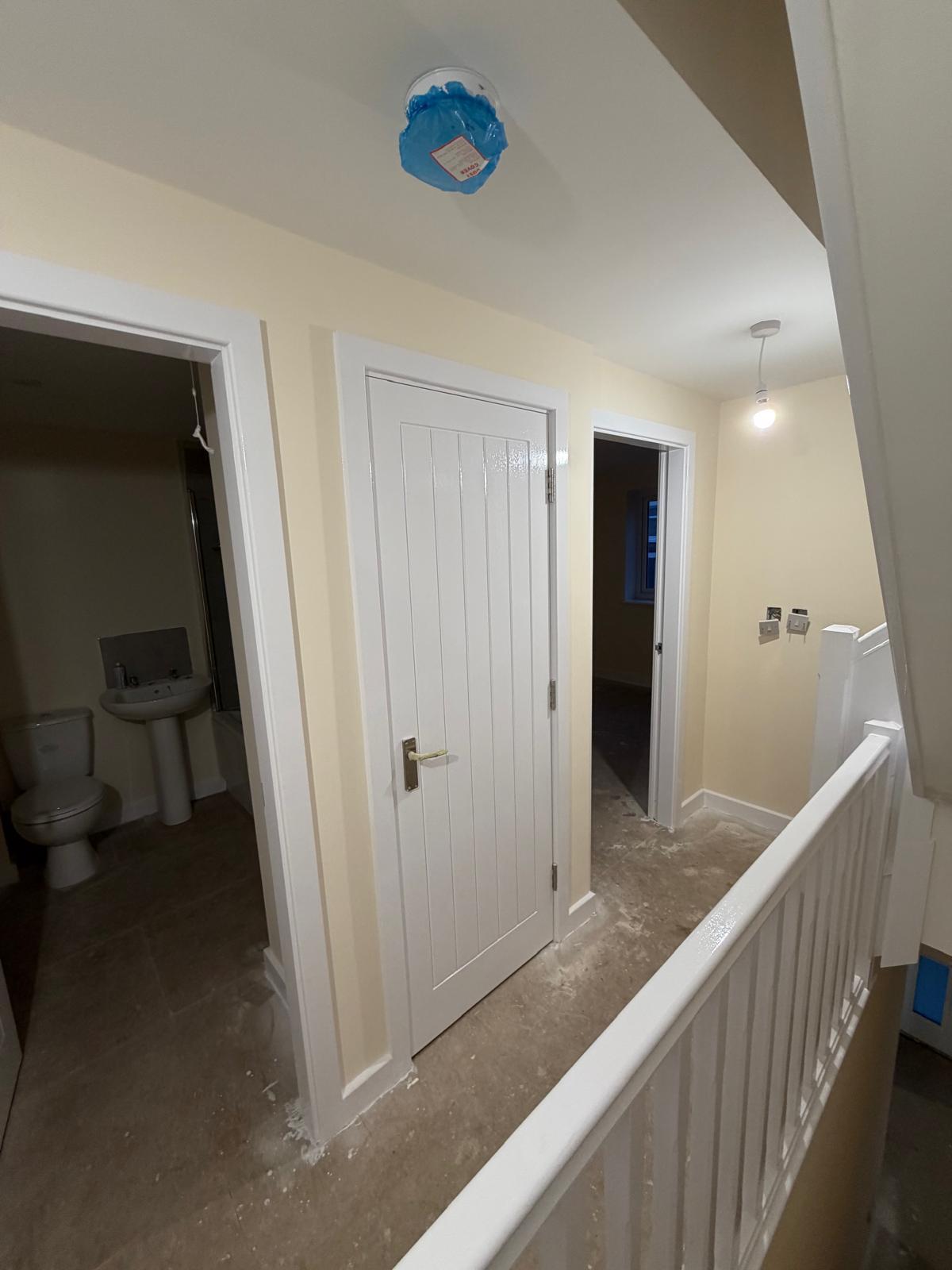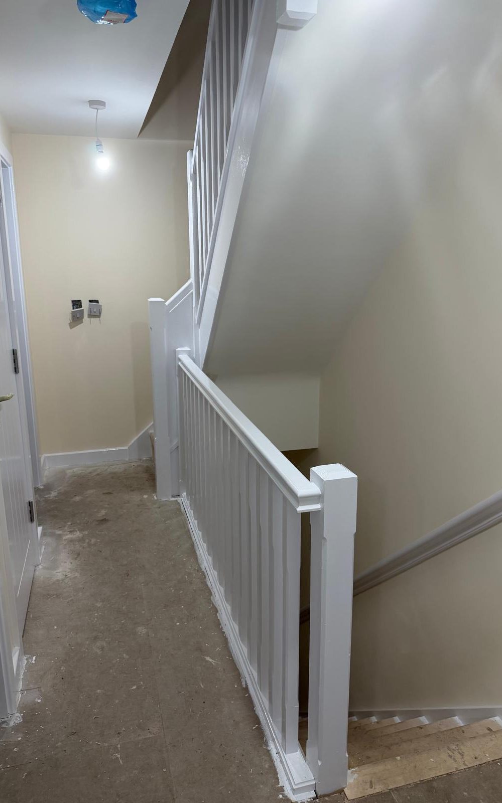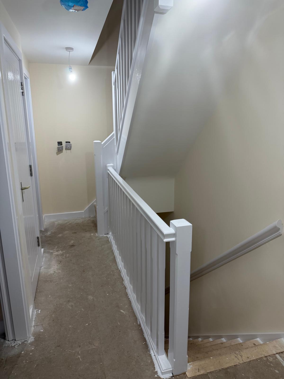 Our scope of works includes matt emulsion to ceilings and walls, applied by spray, roller and brush to achieve a smooth, contemporary finish, complemented by high-quality gloss coatings to all woodwork for a durable, refined result.